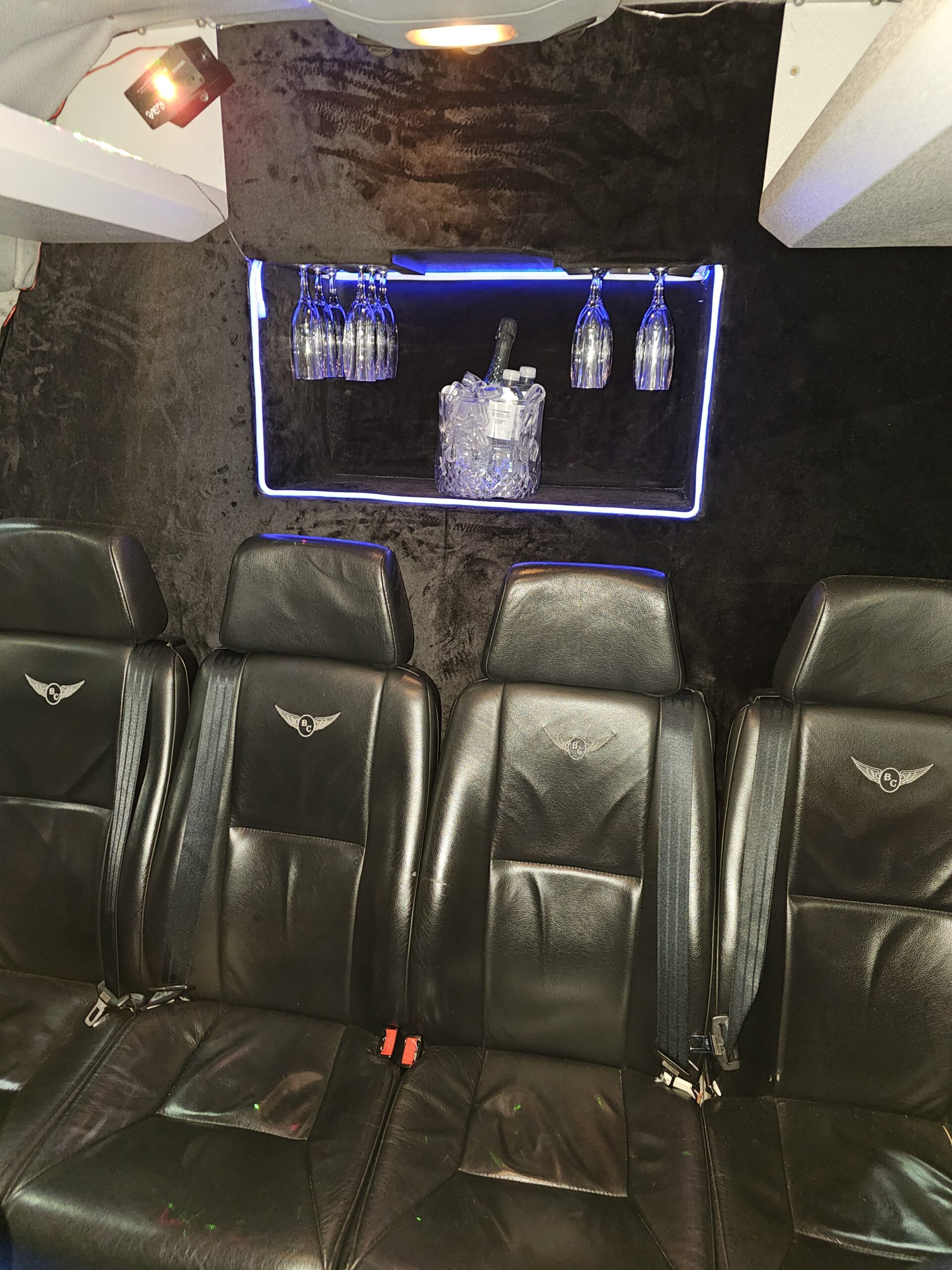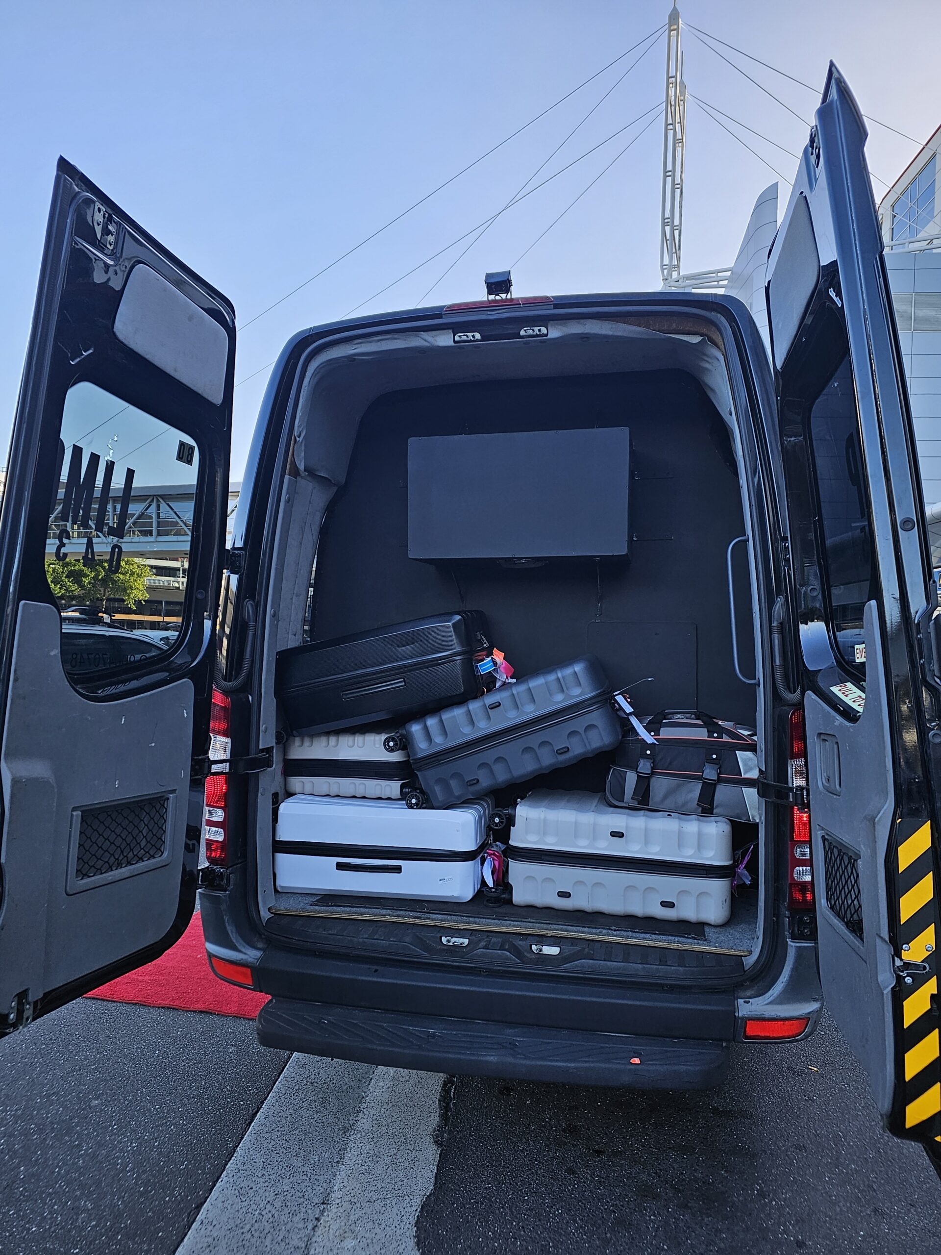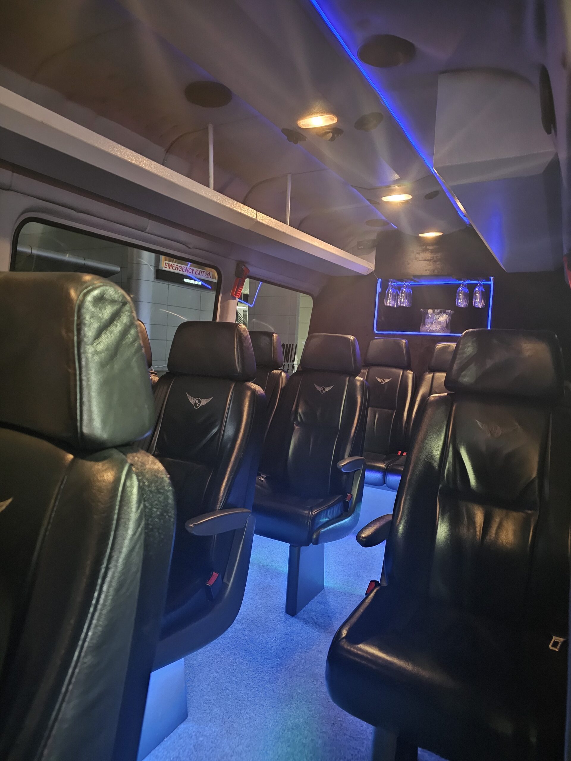 14 Passenger Mercedes Sprinter Van with Built in Bar and Glasses and Certified TV Screen for Passenger Comfort and with 14 Suitcase Bag Carrying Capacity in LWB Long Wheel Base Separate Cargo Area.Perfect for Airports and Golf and weddings.
