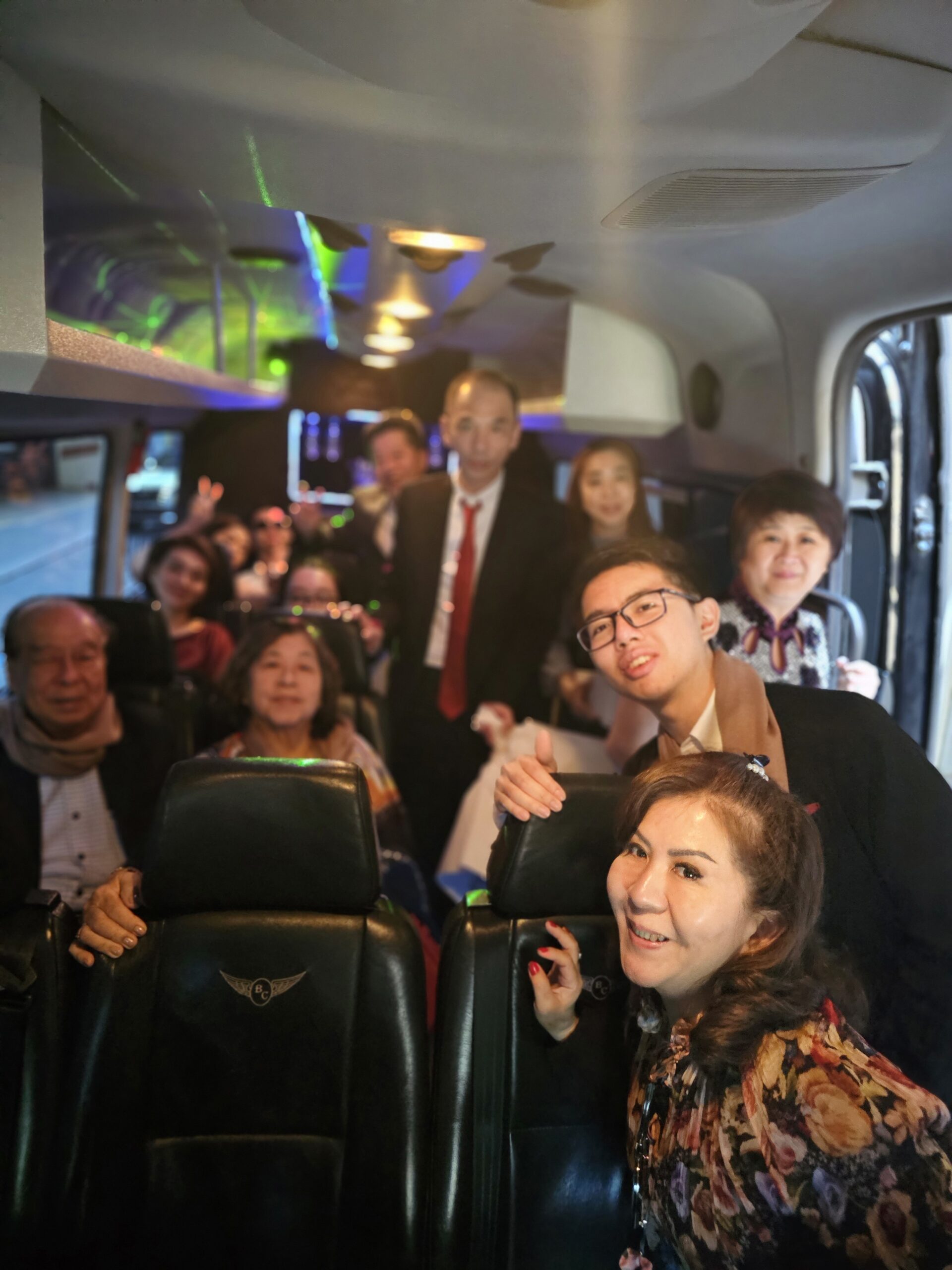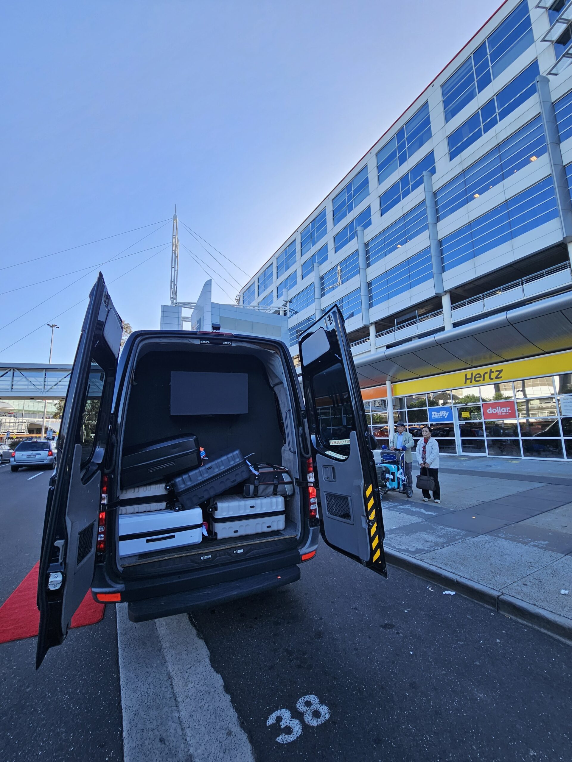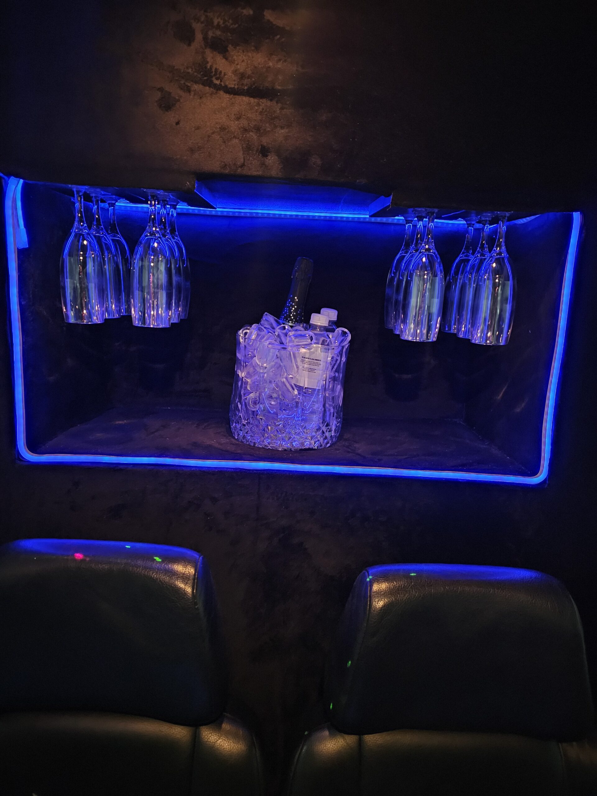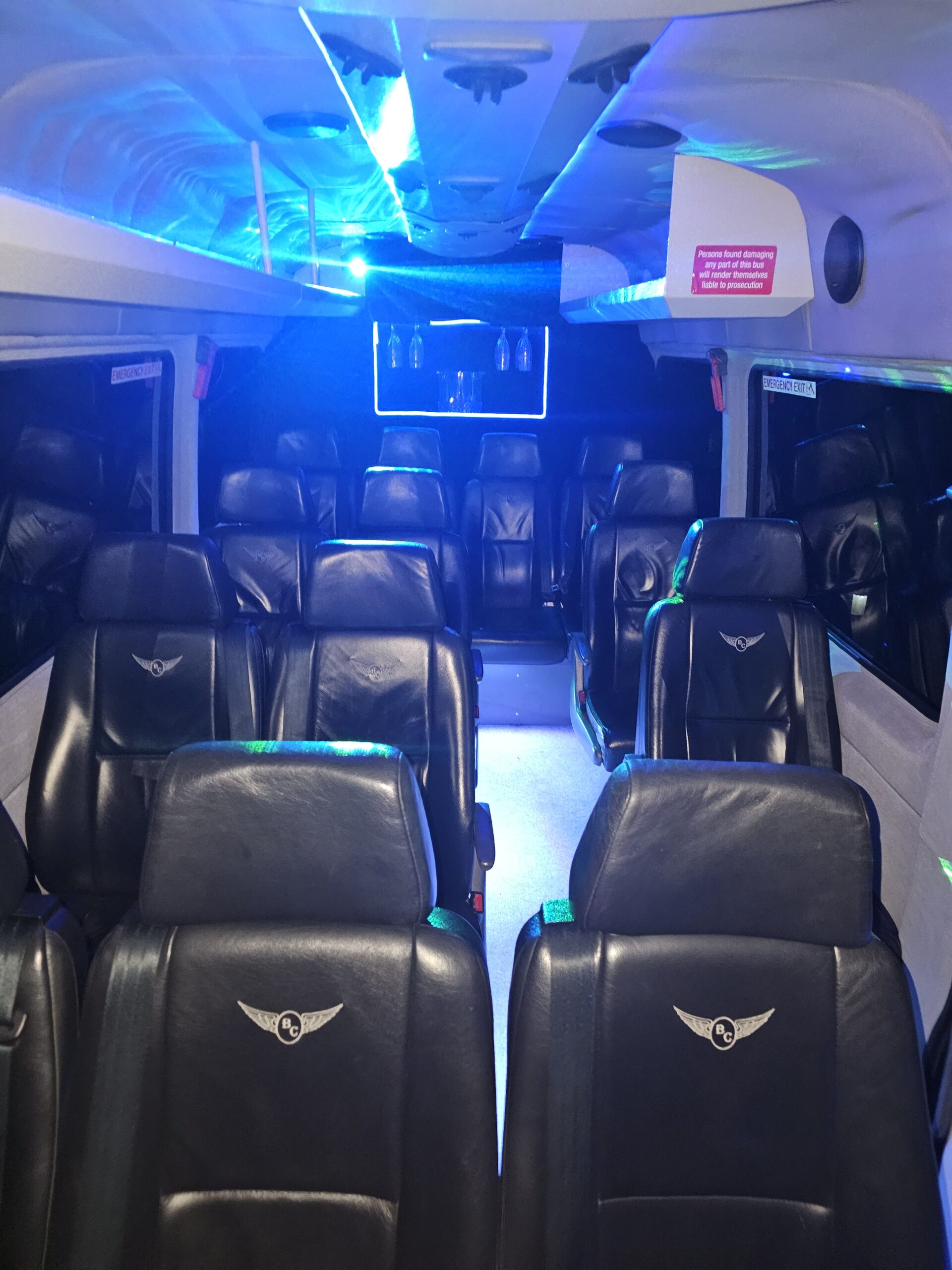 14 Passenger Mercedes Sprinter Van with Built in Bar and Glasses and Certified TV Screen for Passenger Comfort and with 14 Suitcase Bag Carrying Capacity in LWB Long Wheel Base Separate Cargo Area.Perfect for Airports and Golf and weddings.